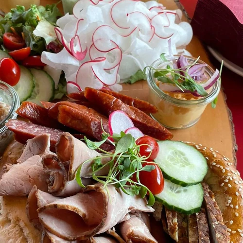 Und auch sonst ist bei uns sehr, sehr vieles hausgemacht. Von den Fleischküchle über die Maultaschen, den Leberkäse, diverse Soßen, Hummus, Kräuterkäse, Grillgemüse, Tellersulz, Dips, Salatsoßen – bis hin zum Eis. Und natürlich unsere vielen Specials, von der Schweinshaxe bis zum Schweinebraten.